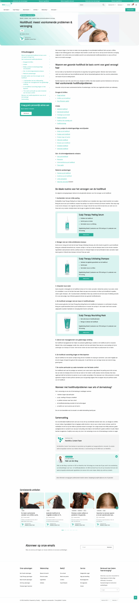Het blog is getransformeerd tot een kenniscentrum dat vertrouwen uitstraalt (EEAT). We voegden categorieën, broodkruimels en een inhoudsopgave toe. Artikelen bevatten nu leestijden, “reviewed by” labels, uitgelichte producten en strategische CTA’s naar de haargroei-quiz.