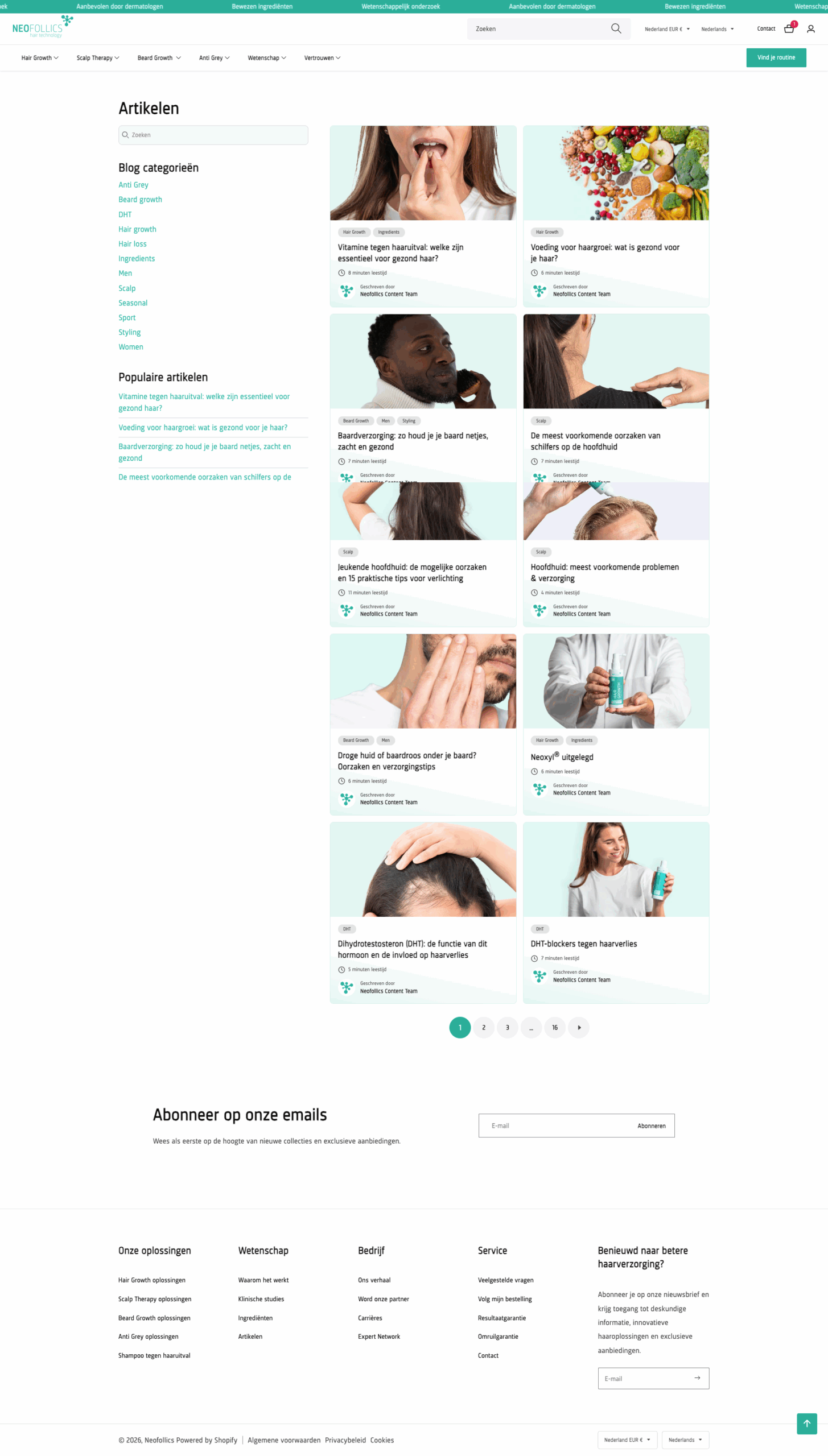 Het blog is getransformeerd tot een kenniscentrum dat vertrouwen uitstraalt (EEAT). We voegden categorieën, broodkruimels en een inhoudsopgave toe. Artikelen bevatten nu leestijden, “reviewed by” labels, uitgelichte producten en strategische CTA’s naar de haargroei-quiz.