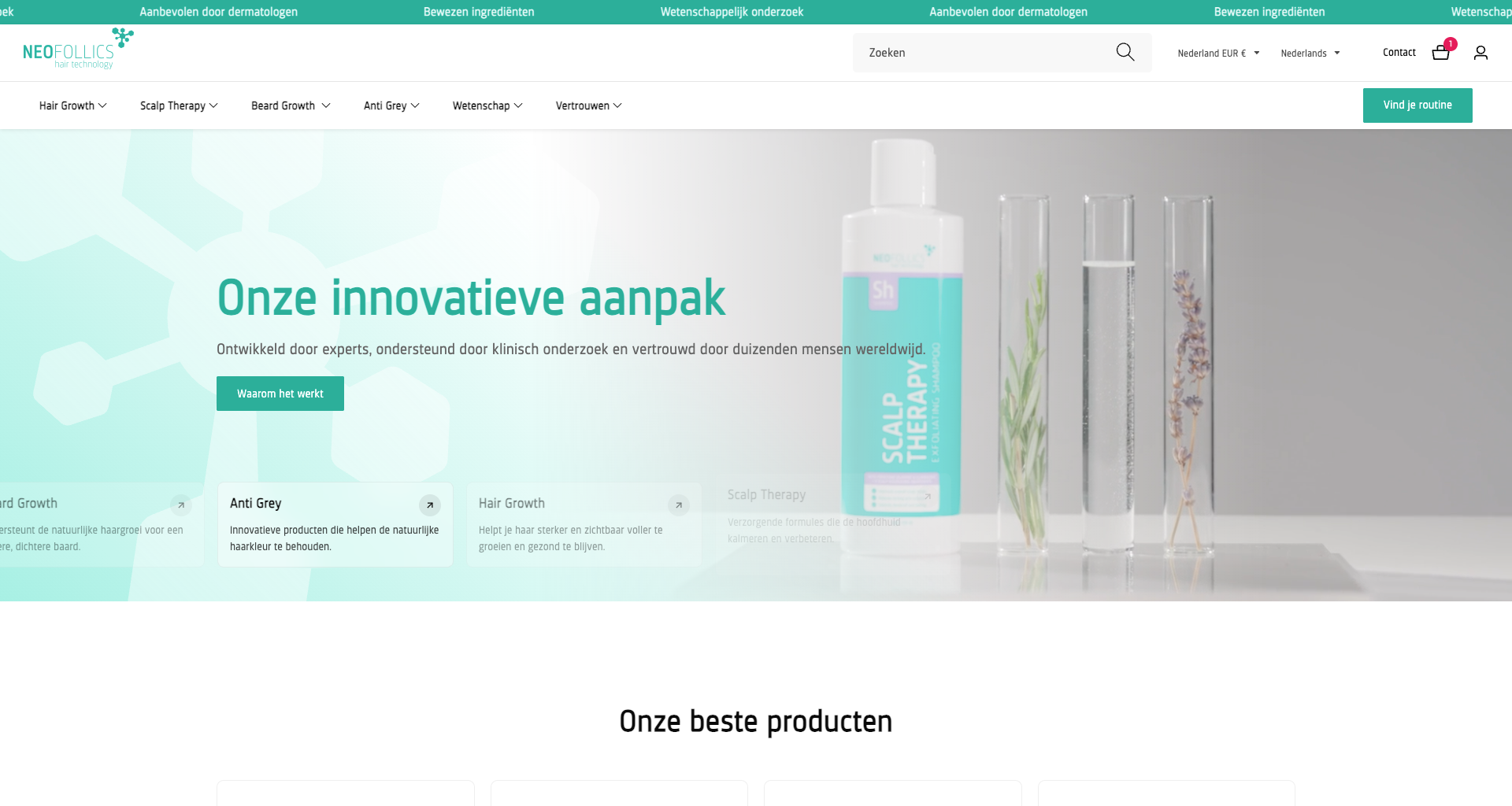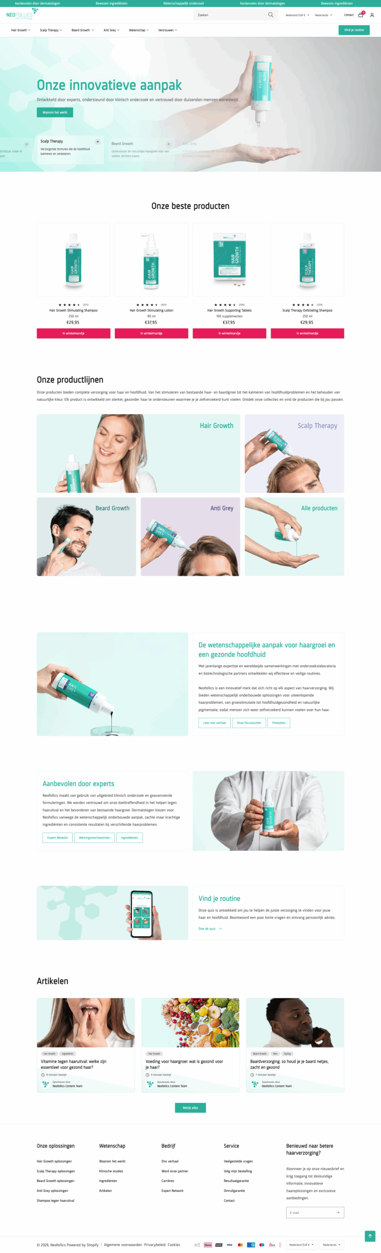 Voor marktleider Neofollics voerden wij een migratie uit naar Shopify 2.0 inclusief UI/UX optimalisatie. Het resultaat? Meer snelheid, betere technische SEO en commerciële slagkracht op internationale schaal.